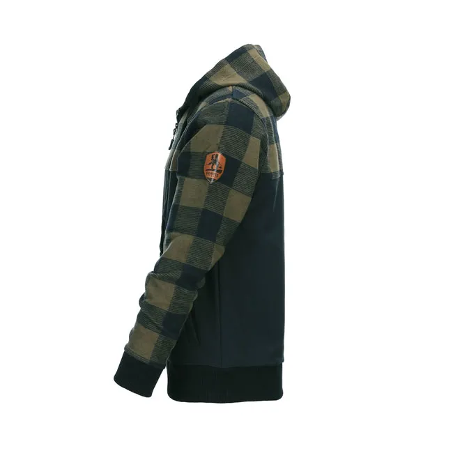 ×A sturdy jacket for various outdoor activities. This unique jacket is a combination of shoftshell and the classic lumberjack shirt. Made of 100% cotton on the top and the bottom is made of 4-way elastic high density fabric which is water resistant. With a vertical chest pocket in the right side, two side pockets, patch on the left sleeve, zipper, hood with drawstring and collar at the wrists.