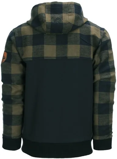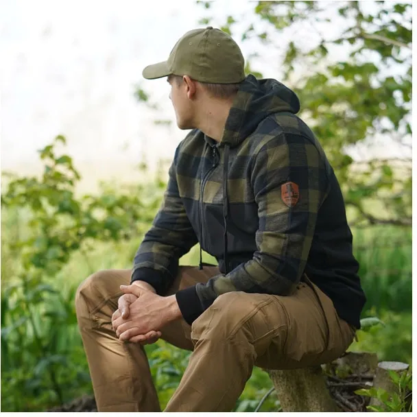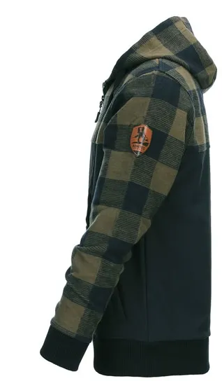 ×A sturdy jacket for various outdoor activities. This unique jacket is a combination of shoftshell and the classic lumberjack shirt. Made of 100% cotton on the top and the bottom is made of 4-way elastic high density fabric which is water resistant. With a vertical chest pocket in the right side, two side pockets, patch on the left sleeve, zipper, hood with drawstring and collar at the wrists.