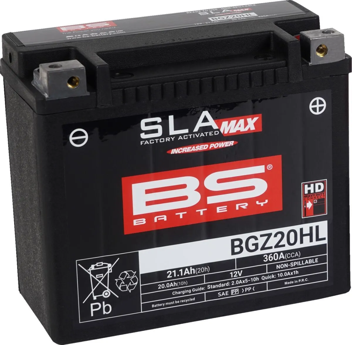 Type: AGM Maintenance Free Negative Terminal Location: Left Front Color/Finish: Black Positive Terminal Location: Right Front Volts: 12 V Style: BGZ20HL Units: Each Model: BGZ Weight: 6,6 kg (14,4 lb) Acid: Factory Activated Height: 154 mm (6-1/16") Length: 176 mm (6-15/16") Width: 89 mm (3-1/2") Battery Chemistry: Lead Acid CCA/Ampere: 360 A Product Name: Battery Battery Capacity: 20 Ah Battery Maximum Charge Rate: 20 A
