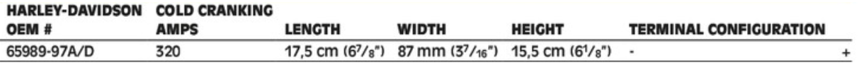 Height: 155 mm (6-1/8") Length: 172,7 mm (6-13/16") Acid: Factory Activated Type: AGM Maintenance Free Battery Capacity: 20 Ah Battery Chemistry: Lead Acid Negative Terminal Location: Left Front Positive Terminal Location: Right Front Battery Maximum Charge Rate: 2 A Product Name: Battery Units: Each Volts: 12 V Model: GYZ Width: 87,3 mm (3-7/16") Weight: 7,12 kg (15,7 lb) CCA/Ampere: 320 A