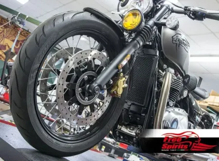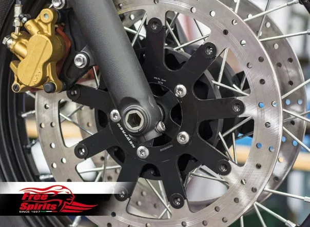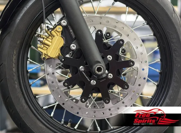 Front Dual Disc Hub CNC machined and designed to suit OEM Bobber and Street Scrambler's Rim, Tire and Axle Assembly.