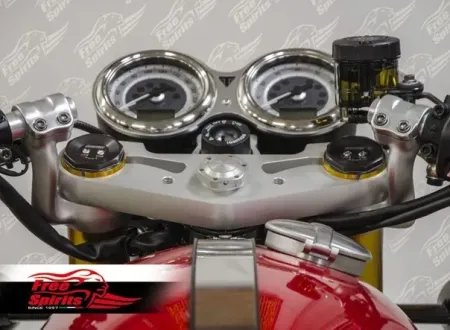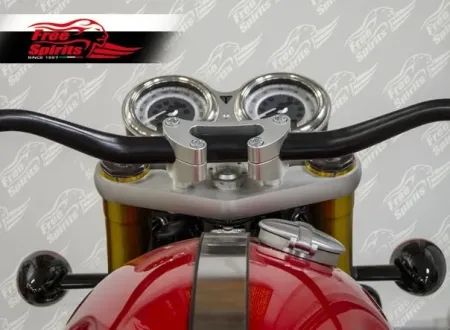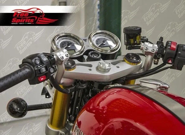 ×Straight triple trees which allows to lower front end of around 23mm. and rise clip on bar of the same amount.