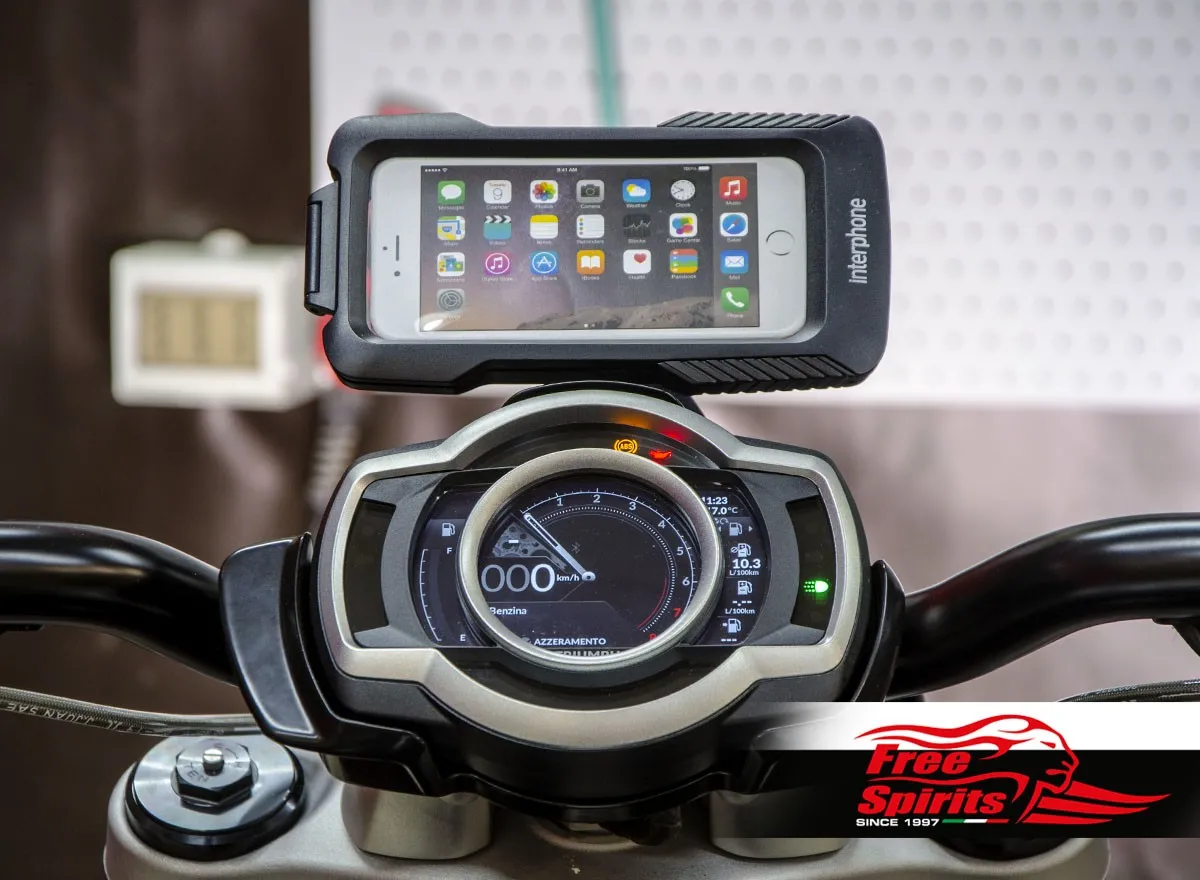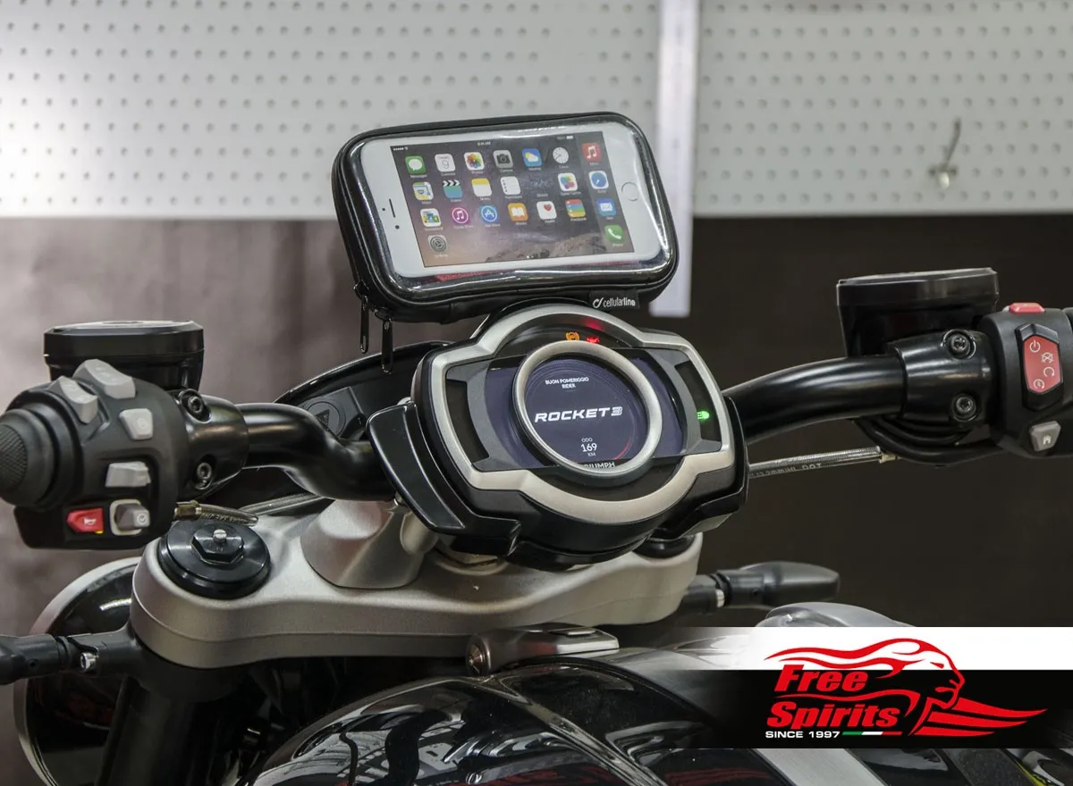 A spherical junction allows you to adjust the device screen to rider’s height, thus allow a good visibility with no reflections.