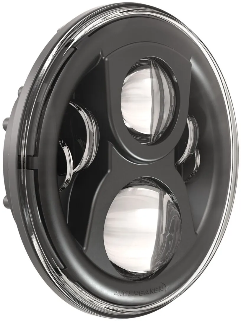 The bright, white LED light of J.W. Speaker headlights just got even brighter. Dual Burn 7″ LED headlights to keep the low beam optics on when drivers switch to high beam. Effective light output on the high beam increases about 10% — while the precise solid optics direct the light and maintain being street-legal.