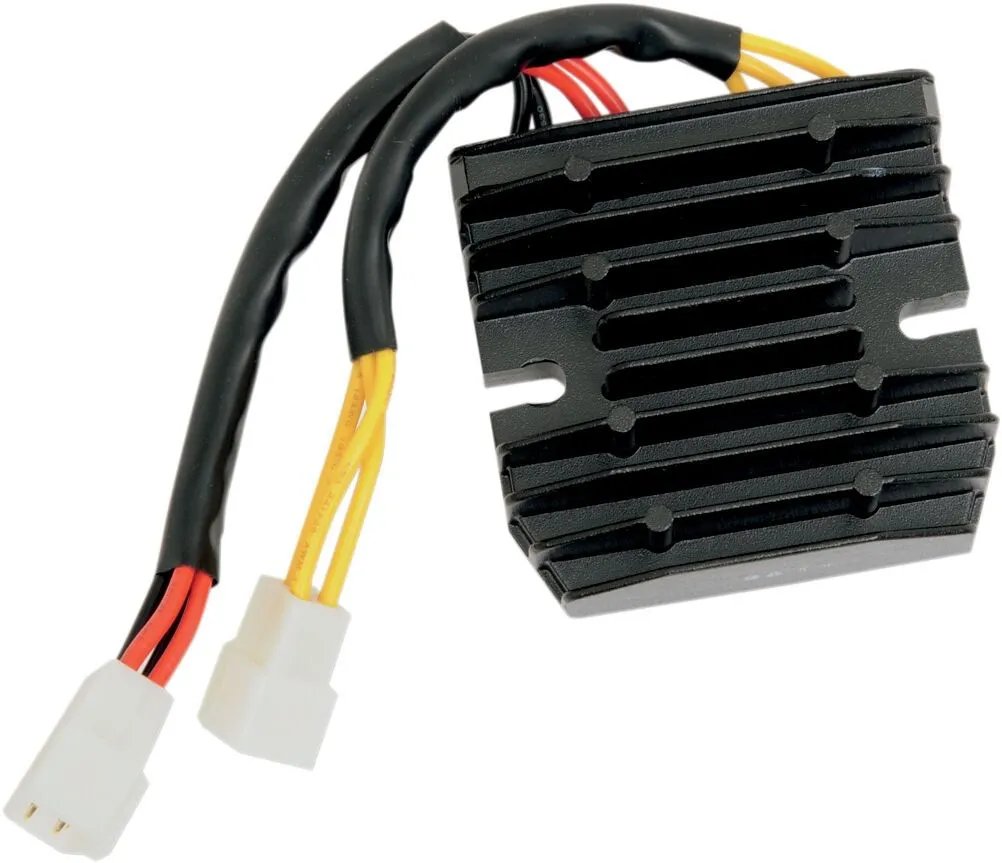 ×'08-'12 Triumph models have two possible rectifiers and regulators; this part has two pigtails with a four-place connector and a three-place connector. For the part that has two connectors mounted flush to the body of the part, see part 2112-1094.