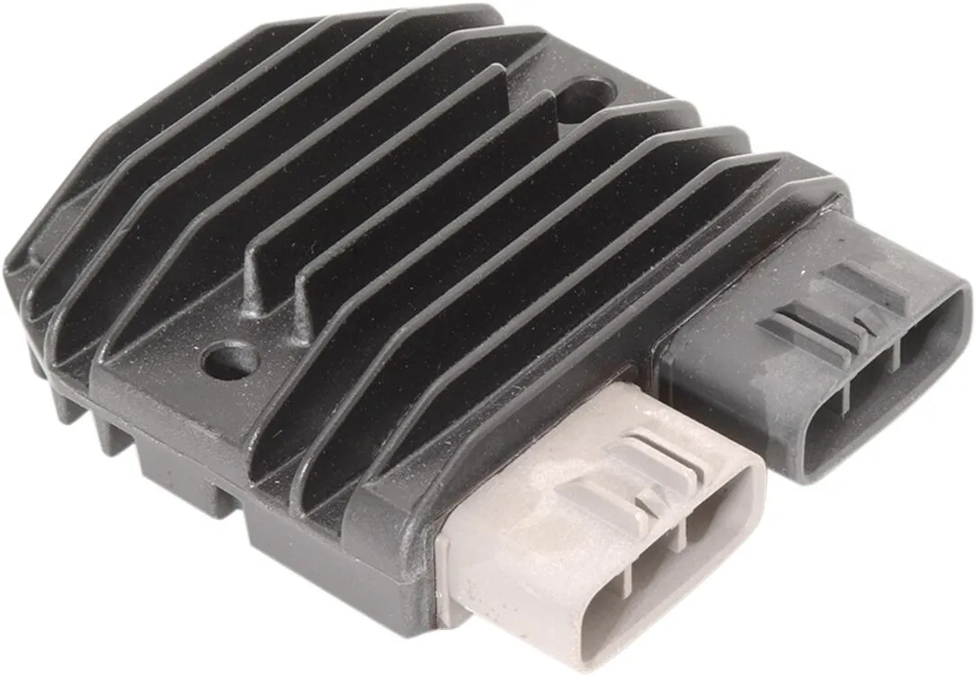 ×'08-'12 Triumph models have two possible rectifiers and regulators; this part has two connectors mounted flush to the body of the part. For the part with two pigtails with a four-place connector and a three-place connector, see part 2112-0565.