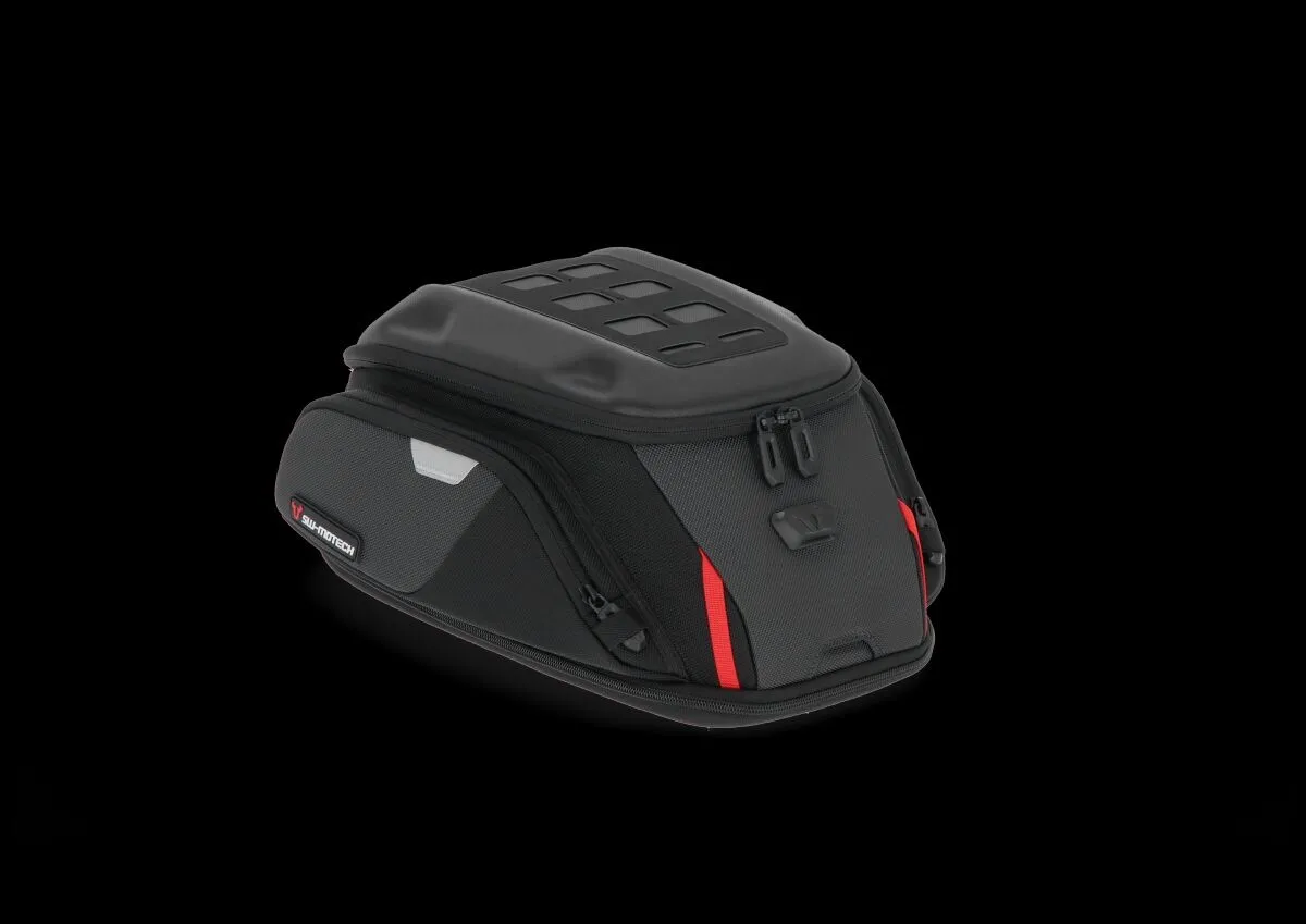 Matching this, SW-MOTECH offers the patented PRO tank rings made of fiberglass-reinforced plastic. They are made to match the motorcycle model. The robust PRO tank ring with magnetic guide aid secures the PRO tank bags with a mechanical QUICK-LOCK snap lock. This allows the tank bags to be attached or removed with just one hand.